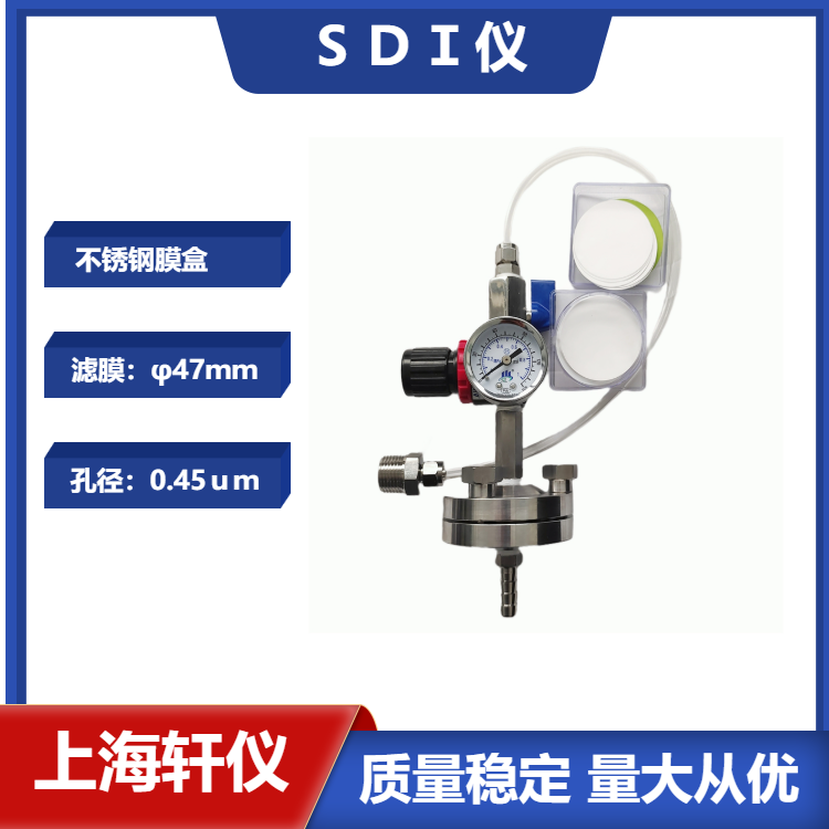 SDI儀 不銹鋼膜盒國(guó)產(chǎn) SDI污染指數(shù)測(cè)定儀是上海軒儀生產(chǎn)的一種過(guò)濾膜盒為不銹鋼材質(zhì)的SDI儀,這套不銹鋼膜盒SDI儀系統(tǒng)包括一個(gè)減壓閥、47mm換膜式過(guò)濾器、膜片和一些必要的閥門(mén)、連接管和連接件。SDI儀膜盒采用304不銹鋼材質(zhì),質(zhì)量穩(wěn)定,可靠耐用。這款不銹鋼手動(dòng)SDI儀系統(tǒng)包含一盒測(cè)試濾膜(100片裝),完全符合ASTM D4189-07方法的要求。使用這套SDI測(cè)試儀裝置,只需要準(zhǔn)備一個(gè)量筒和秒表就可以在線(xiàn)測(cè)定SDI值。